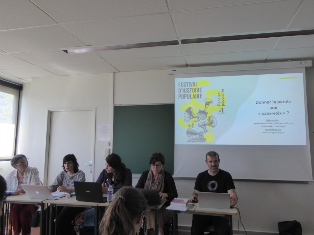 Alice Krieg-Planque, Émilie Née, Cyrielle Montrichard, Claire Oger et Benjamin Ferron pendant la table ronde « Donner la parole aux ‘sans-voix’ ? ».