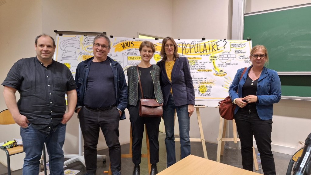 Étienne Penissat, Emmanuel Laurentin, Anaïs Albert, Déborah Cohen et Mathilde Rossigneux-Meheust posent devant la fresque réalisée par Marie Caron pour la conférence « Vous avez dit ‘populaire’ ? »